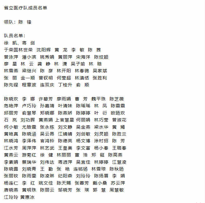 我省此批援助湖北的2支医疗队共277人。其中,福建省立医院选派临床医师37名,护理人员100名,行政保障人员1名,由省立医院副院长、省急救中心主任陈锋担任领队,医院院办副主任徐凯、金山医院医务部负责人蒋剑为联络员。福建医科大学附属协和医院选派临床医师37名,护理人员100名,行政保障人员2名,由福建医科大学附属协和医院平潭分院副院长张尉担任领队,医务部副主任魏琴为联络员。