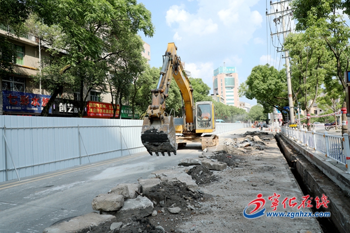 5月19日,在宁化县城区南大街“白改黑”项目施工现场,挖掘机、切割机正不停运转,工人们正进行道路病害处理、水沟盖板置换等作业。