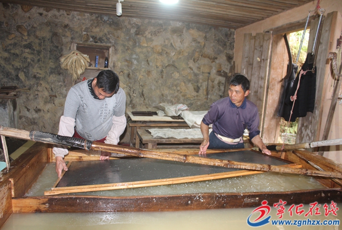 2月17日,走进宁化县治平畲族乡下坪畲族村茜坑玉扣纸生产作坊,便能听见“哧嚓、哧嚓”的声响,两位踏竹麻师傅正熟练作业,手抓吊环,左脚支撑,右脚高抬划出90度弧线,全力踩踏,将竹浆踏成糊状,几名造纸师傅也在各自岗位上忙碌,有序完成造纸的一道道工序。