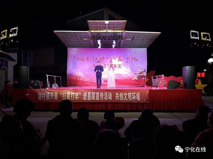 巡演活动,不仅有县演出团队带来的华丽演出,还有湖村镇本地文艺工作者自编自排歌颂祖国大好河山、扫黄打非、反电诈、平安建设三句半等文艺节目穿插期中,让群众大饱眼福。