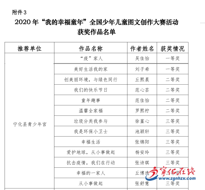 近日,全国少年儿童“心中有祖国•心中有他人”主题教育活动组委会举办的“我的幸福童年”为主题的图文创作大赛公布获奖名单,宁化县13名小学生分获一二三等奖,13位教师获优秀辅导奖。